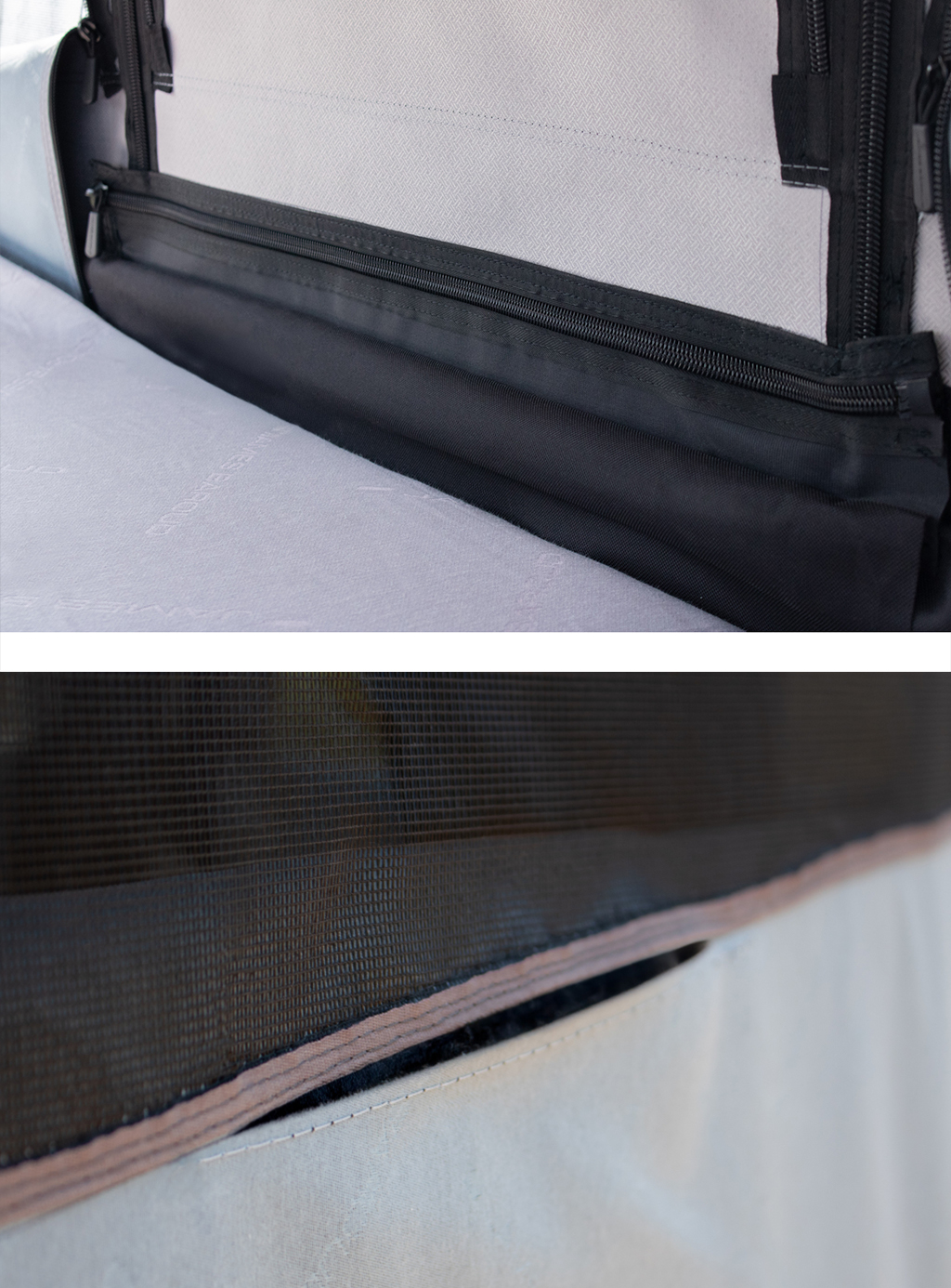 La tente est fournie en équipement standard avec une échelle télescopique, un matelas en mousse haute densité de 65 mm, un système de ventilation solaire silencieux (VMC), des rangements intérieurs, une rampe lumineuse LED ainsi que des supports prévus pour traverses.