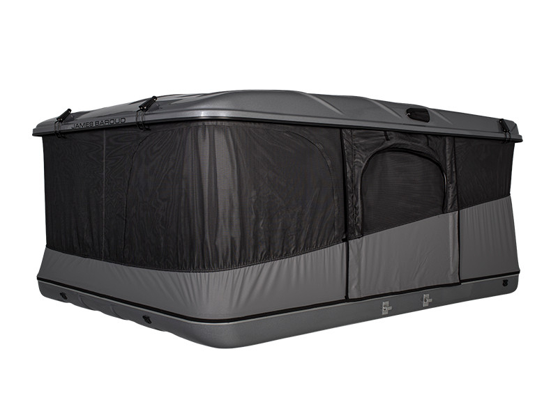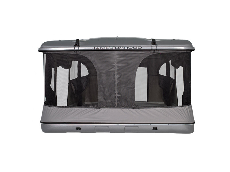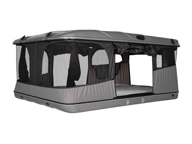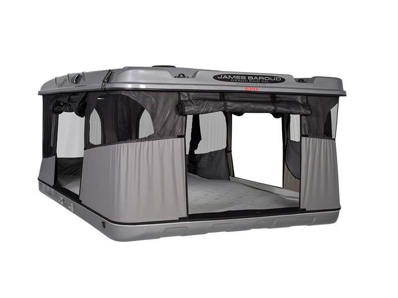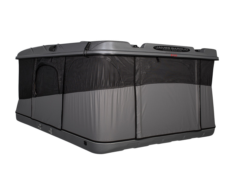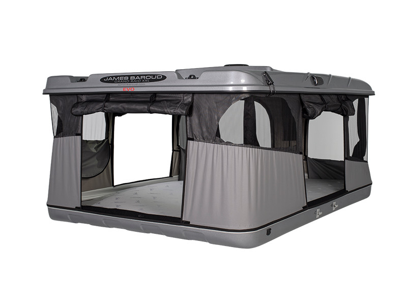 Construite sur le même concept que l'Evasion avec son ouverture horizontale et sa vue panoramique à 360°, la tente de toit James Baroud Grand Raid se différencie par son porte-bagages qui peut supporter une charge de 25 kg. Elle est la tente la plus spacieuse de la gamme dans sa taille XL, sa taille M étant adaptée à deux personnes et un enfant.
